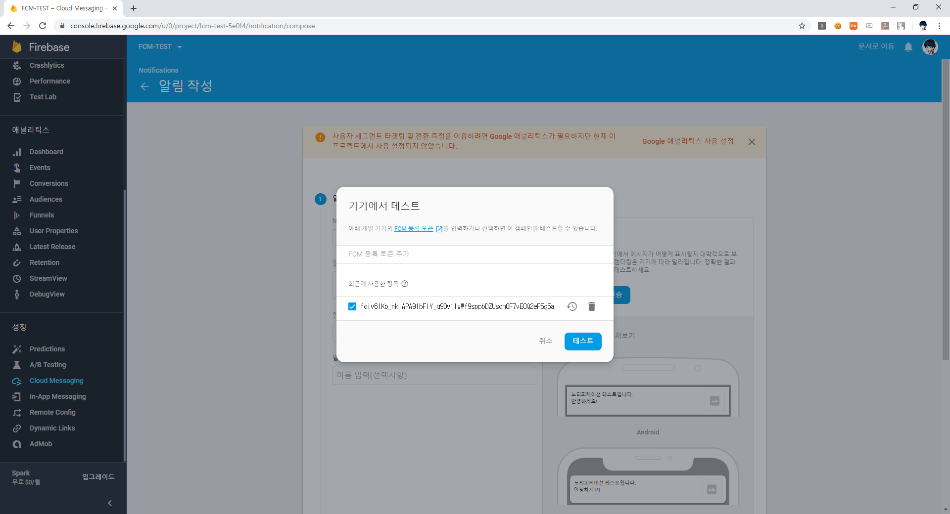 알림 타이틀과 텍스트를 입력해주신 뒤 테스트 메시지 전송 버튼을 눌러주시고