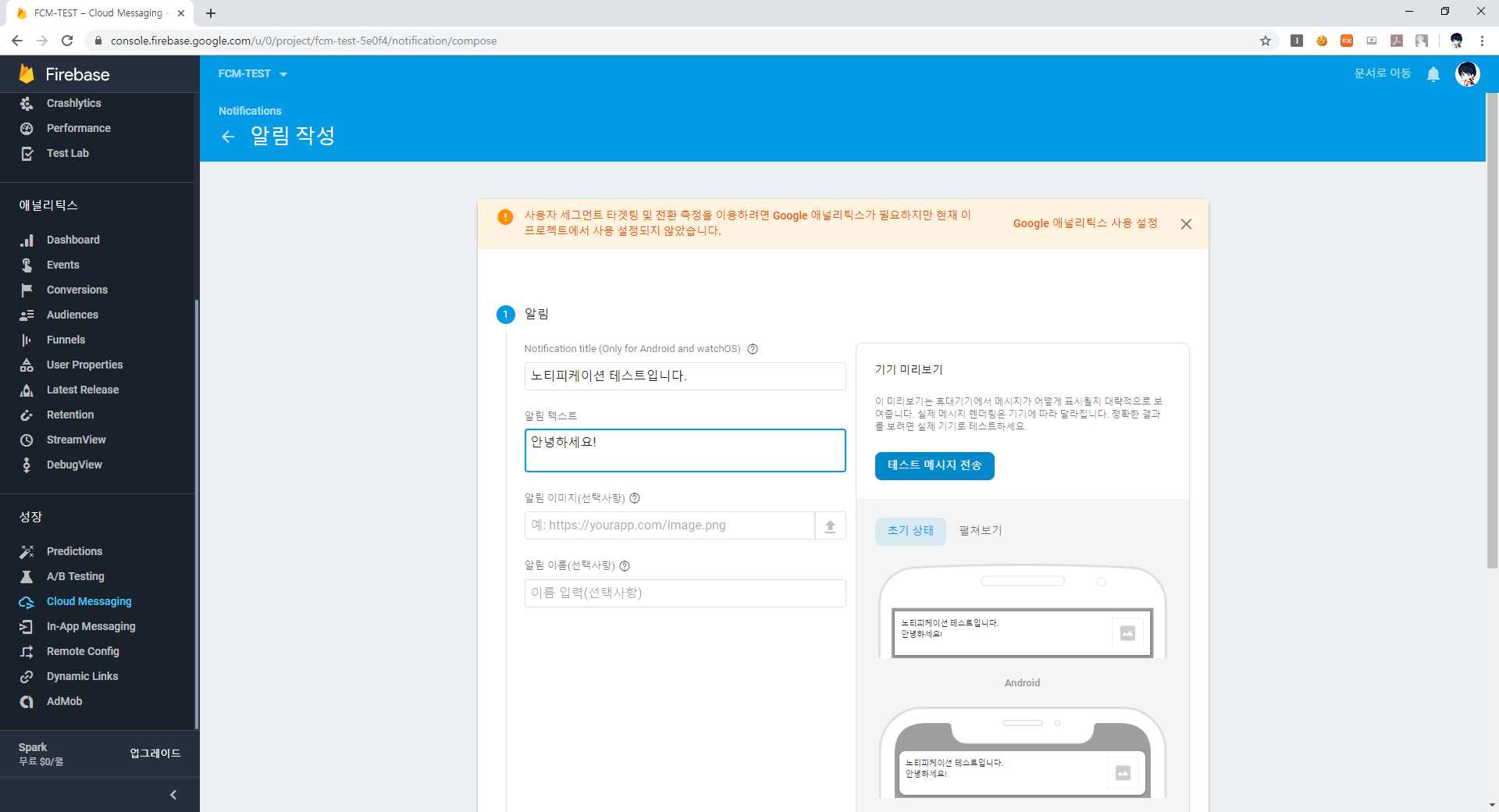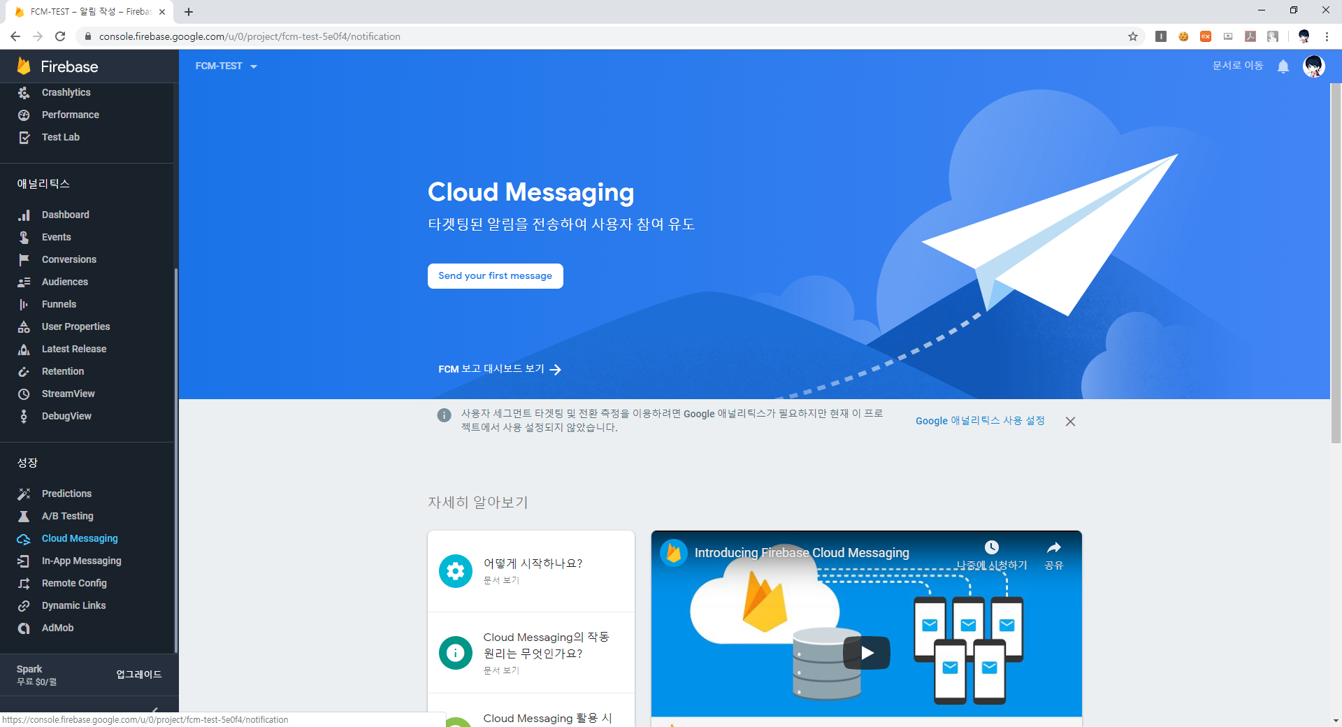 Firebase Console에 접속하여서 좌측 하단 성장 탭의 CloudMessaging을 들어가줍니다.