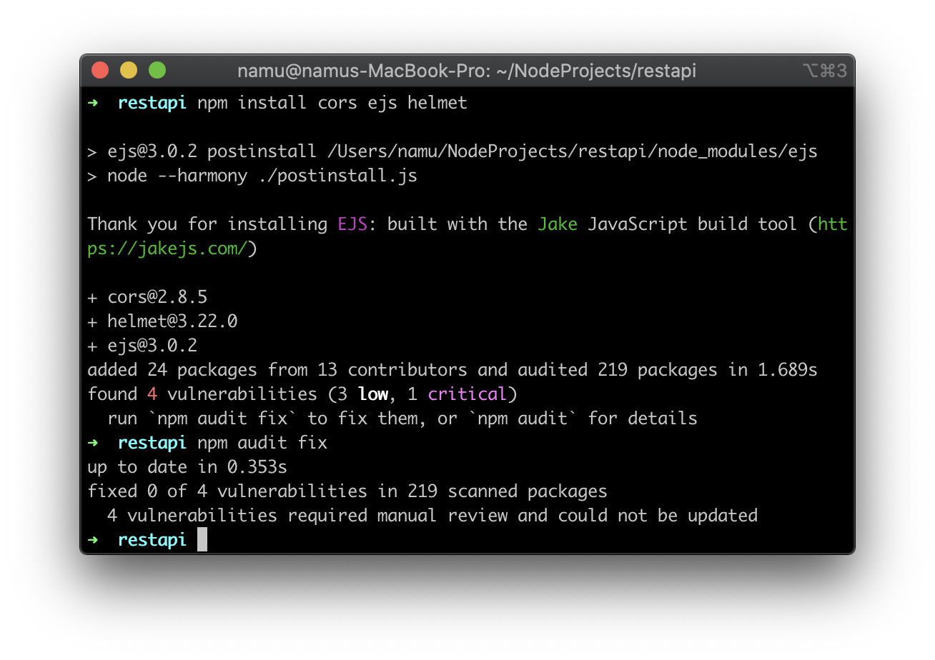 `npm install cors ejs helmet`
