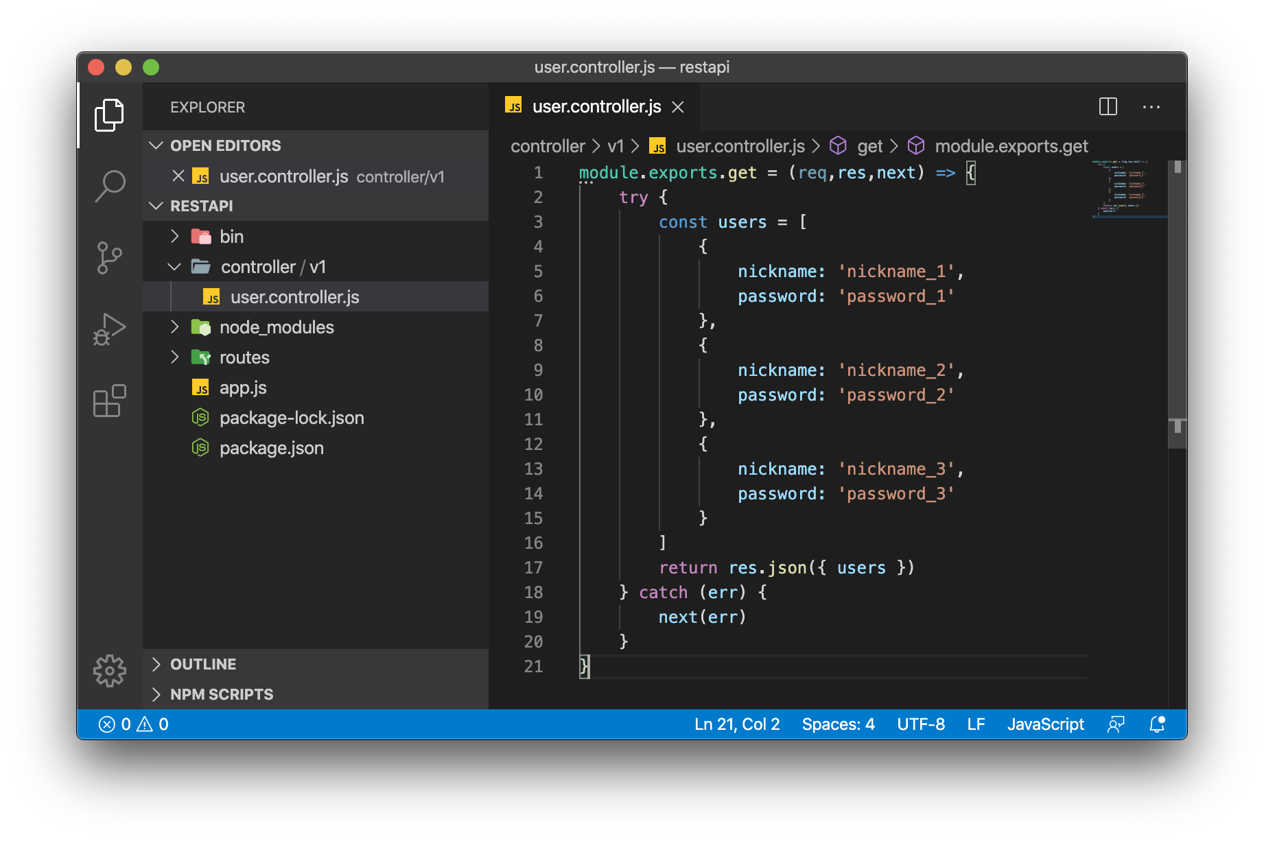 controllers 폴더 안에 v1 폴더를 만들고 그 안에 user.controller.js 파일을 생성해주도록 합시다.