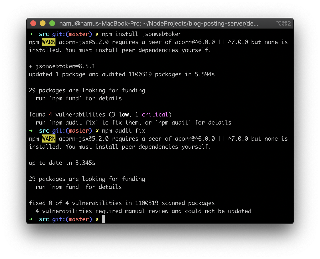 위와 같은 통신을 하기위한 jwt 모듈을 설치해주도록 합시다. `npm install jsonwebtoken`