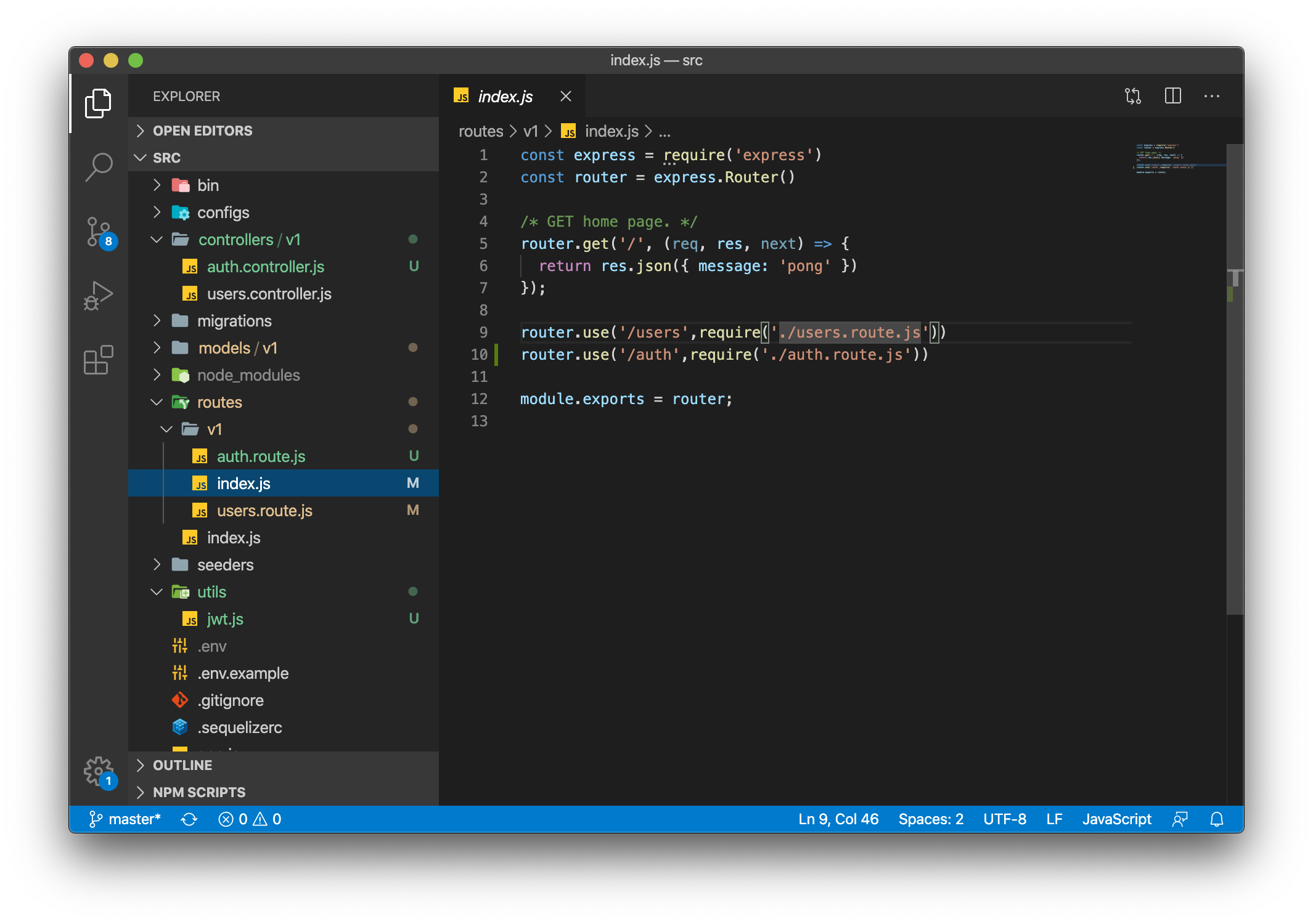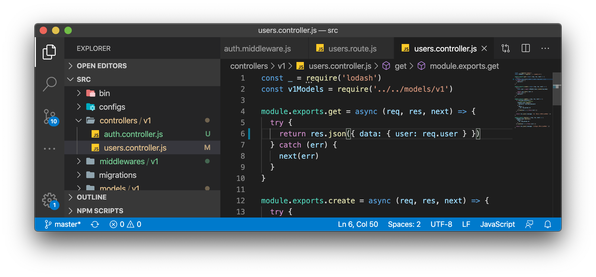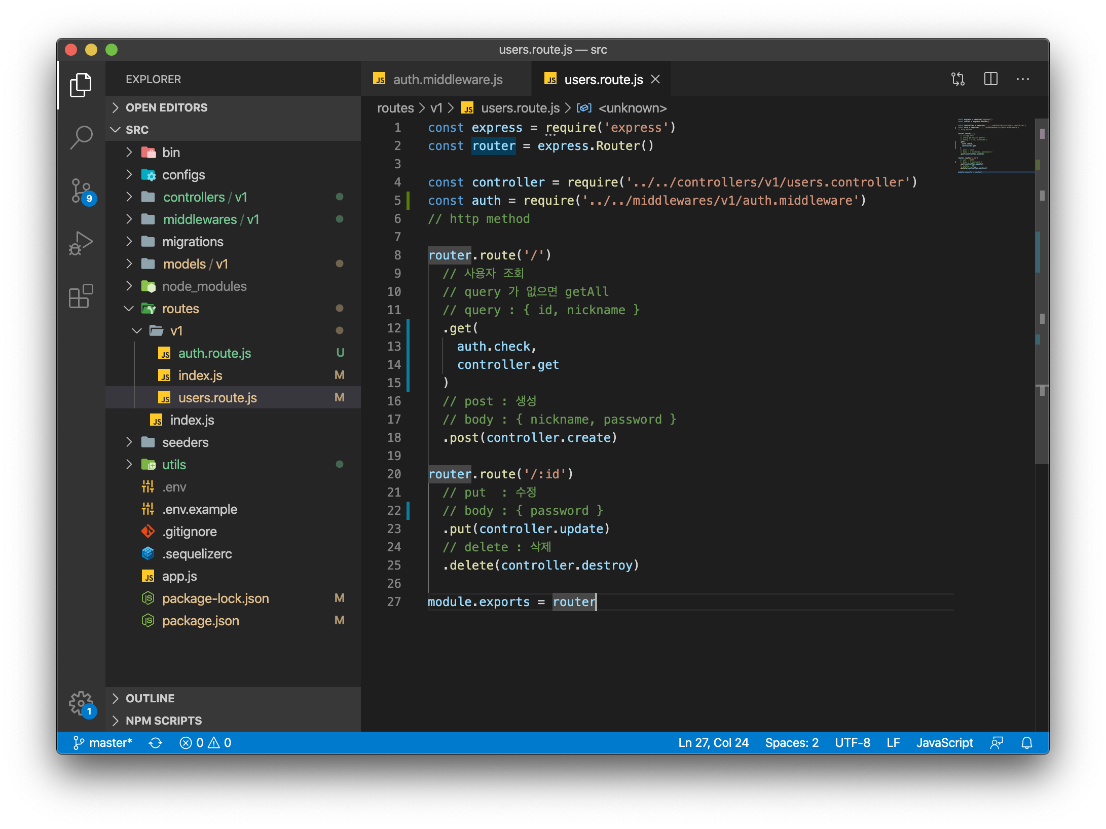 이제부터 GET /users/ 메서드를 요청 시 auth.check 후 controller.get 함수를 타게 될 것입니다.