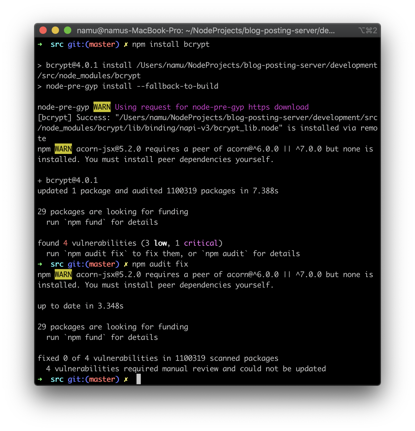 우선 해시 암호화를 해주는 bcrypt 모듈을 설치해주도록 합시다. `npm install bcrypt`