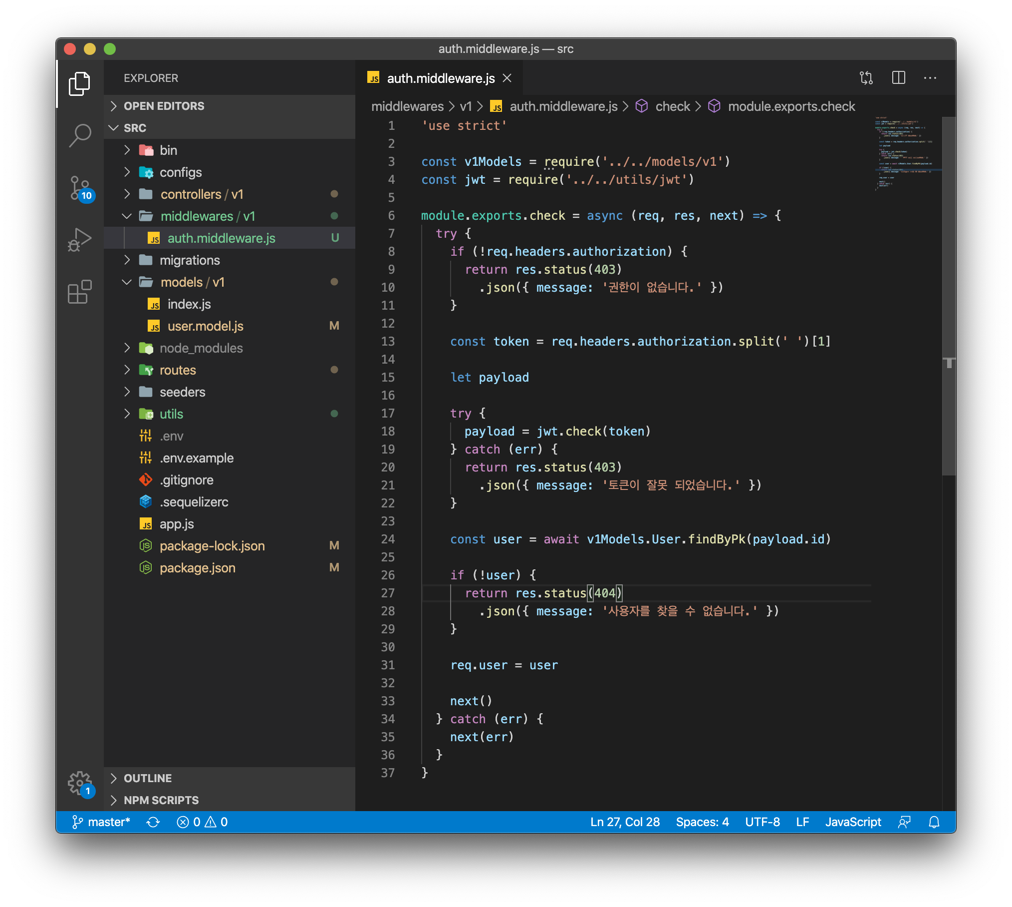 아래와 같이 middlewares/v1 폴더에 auth.middleware.js 파일을 하나 생성해주고 아래와 같이 작성을 해주도록 합시다.