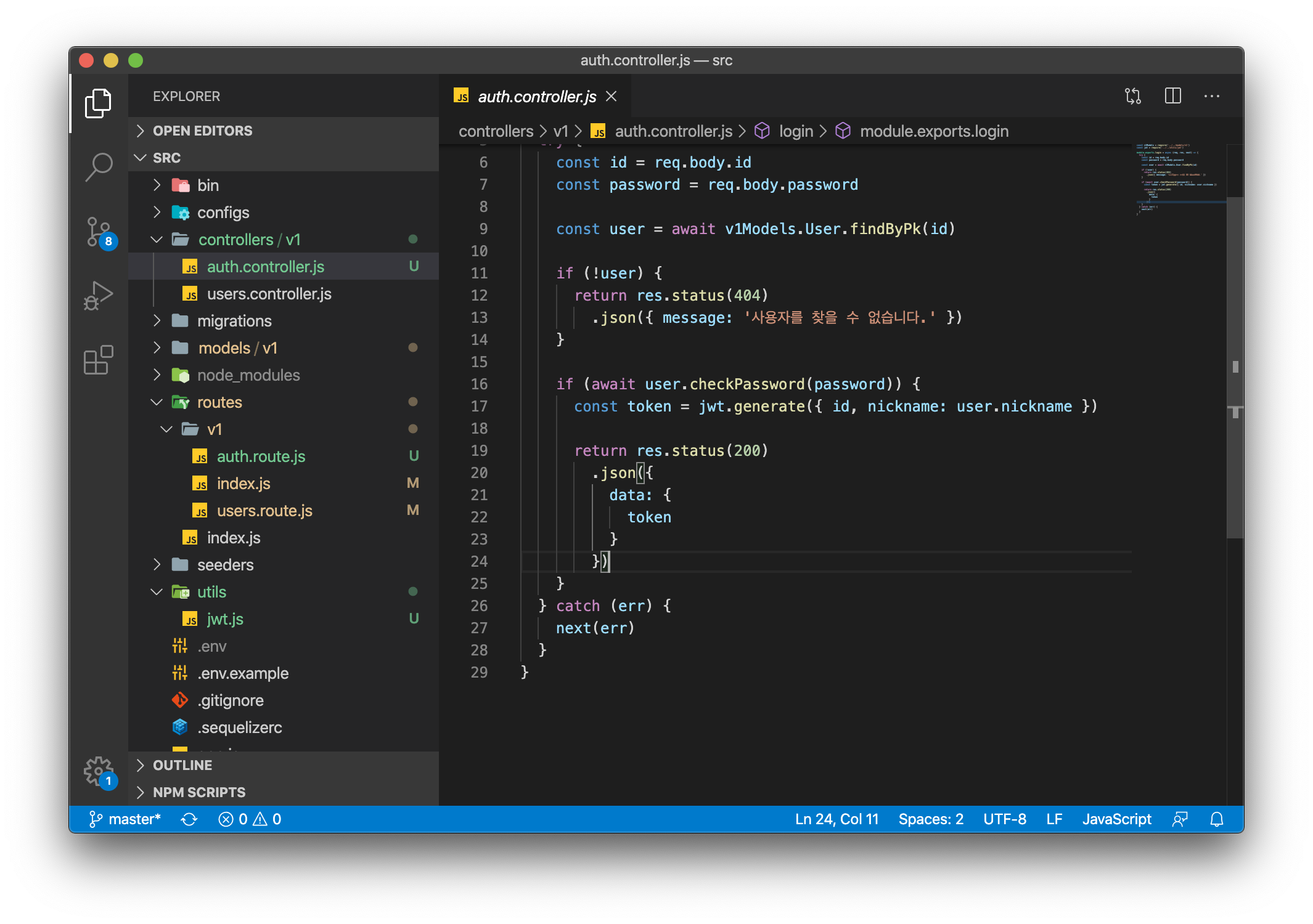 이제부터 GET /users/ 메서드를 요청 시 auth.check 후 controller.get 함수를 타게 될 것입니다.